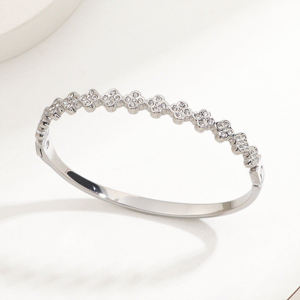 Elevate your wrist with this stunning clover rhinestone bangle, crafted from premium titanium for lasting durability and comfort. The delicate four-leaf clover design sparkles with brilliant rhinestones, adding a touch of elegance to any outfit. Lightweight yet sturdy, this bangle resists tarnishing and irritation, making it perfect for everyday wear or special occasions. A timeless piece that combines style with quality craftsmanship.