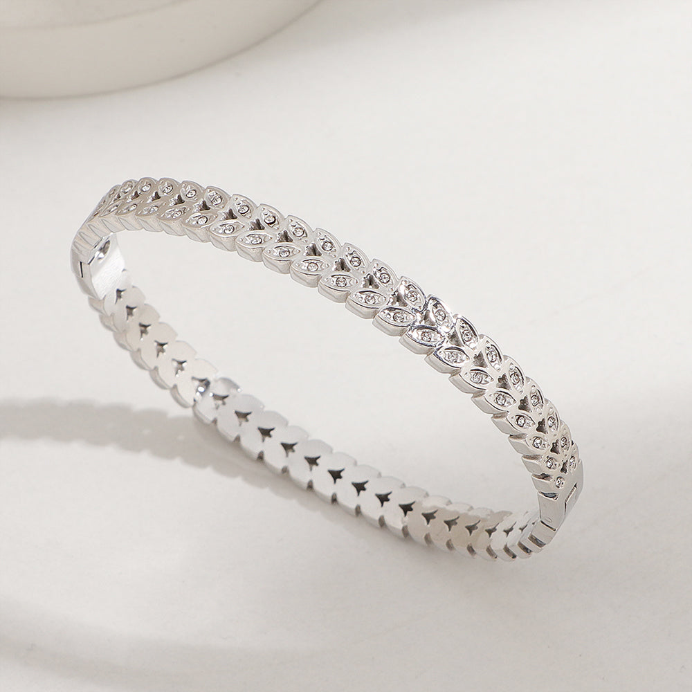 Discover lightweight elegance with this Wheat Chain Bangle, expertly crafted from premium titanium. Known for its exceptional durability and hypoallergenic properties, titanium makes this piece ideal for sensitive skin while maintaining a brilliant shine. The intricate wheat chain design showcases refined craftsmanship, offering a sophisticated aesthetic that works beautifully as a standalone statement or layered with other pieces. Durable enough for daily wear, this bangle combines timeless style with modern material innovation.